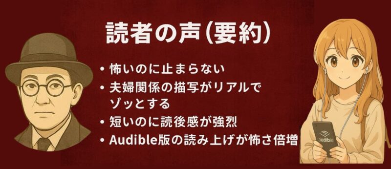 「短いのに深い」「人間の闇に触れた感じがする」「乱歩の本気を見た」といった声も多く、強烈な印象を残す作品です。